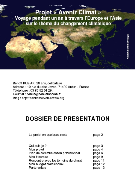 J'ai terminé mon dossier de présentation pour le projet "Avenir Climat". 13 pages pour tout savoir sur moi, sur le but du voyage et la changement climatique, le parcours que je suis en train de préparer, le programme de communication et le budget prévisionnel. J'ai rajouté quelques images issues de mes voyages et des illustrations sur le changement climatique. Le document est disponible sur le blog en 2 versions avec ou sans images. Il est chaudement recommandé de :