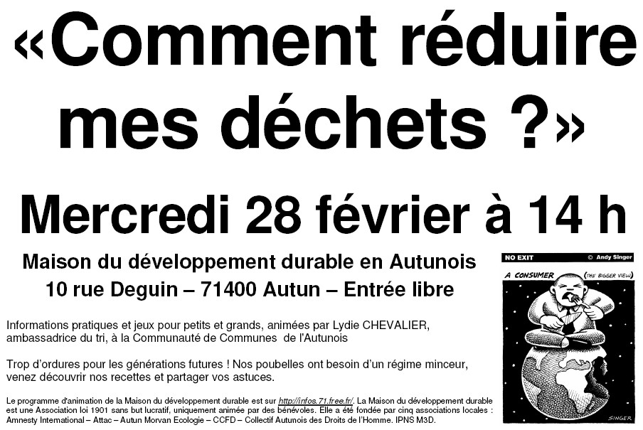 J'organise depuis le début de l'année 2007 des ateliers pour l'association la Maison du Développement Durable en Autunois dans le but de partager des connaissances et des pratiques avec des personnes-ressources locales. Les thèmes traités : phytocide, déchet et énergie.