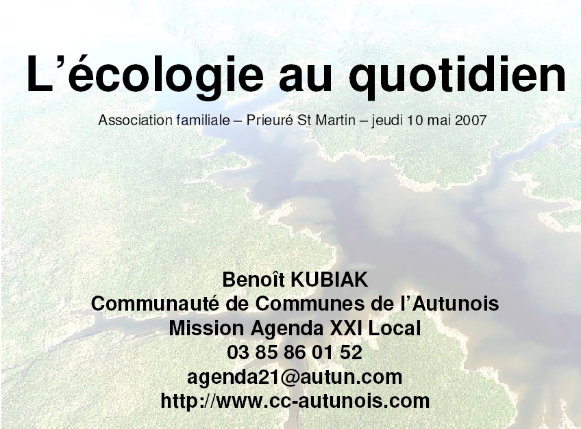 J'en parlai dans ce billet, voici donc mon diaporama diffusé hier jeudi 10 mai 2007 au centre social du prieuré saint martin à saint pantaléon. Le thème était "les éco-gestes à la maison", à destination des adultes relais de l'association familiale de l'autunois et des habitantes du quartier (uniquement des femmes) : une quinzaine de présente.