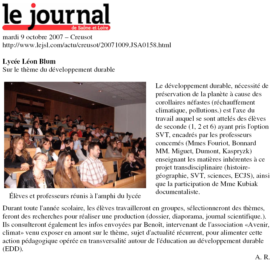 J'ai pris contact avec les élèves des classes de seconde qui me suivront avec leurs professeurs de SVT et de géographie le mercredi 3 octobre 2007. Ils sont au lycée Léon Blum (site internet du lycée, présentation de Léon Blum).
