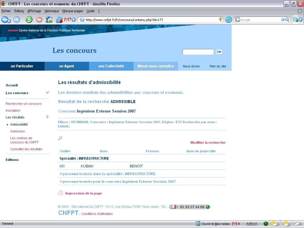 Je vais donc préparer cet oral, et l'examen aura lieu la semaine du 18 juin, pour des résultats le 5 juillet 2007. Si tout va bien, avec le bénéfice du concours, j'ai une période de 3 ans pour intégrer une collectivité territoriale (communes, communauté de communes, communauté d'agglomérations, syndicat mixte, département ou région) en tant que stagiare, soit le 5 juillet 2010 théoriquement. Après 1 an de stage, je suis admis définitivement dans la Fonction Publique Territoriale, ce qui est quand même un gage de sécurité pour l'emploi !