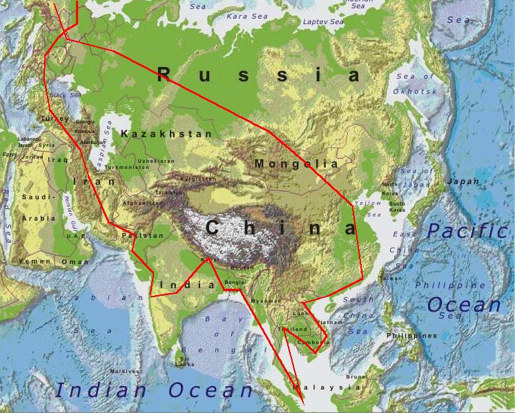 Il me reste ensuite tous les autres moyens de transport, en particuliers les trains et les bus. Je devrais contourner la Birmanie, dont les frontières terrestres sont fermés pour les occidentaux, et utiliser un bateau, certainement entre Calcutta et Singapour. Je rentrerai en Europe par le transsibérien, entre Pékin et Moscou.