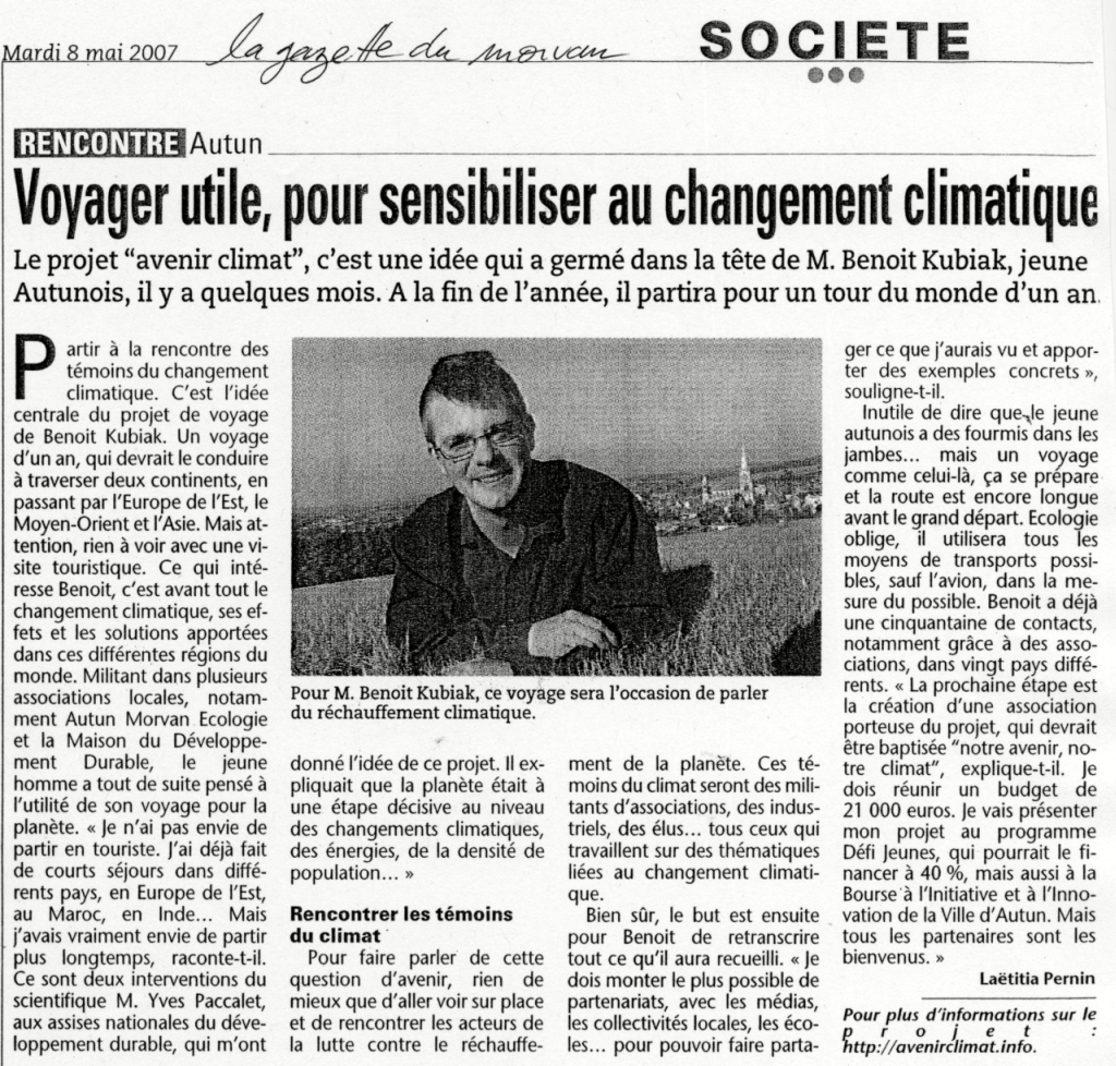 J'ai quitté mon boulot fin décembre . J'ai envie de voyager, et de voyager utile. Le changement du climat est en train de se faire et modifie profondément ma vie et celle de mes (éventuelles) enfants, petits-enfants, arrières petits-enfants et des 8 milliards de terriens qui vivront sur le reste de notre planète en 2100.